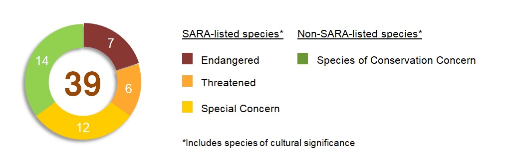 39 species that regularly occur in Kejimkujik and NHSs of Mainland NS are addressed in this action plan: 25 SARA-listed species and 14 additional species of conservation concern e.g., COSEWIC assessed but not SARA-listed, provincially listed and/or culturally significant species. Thirteen of the SARA-listed species are Extirpated, Endangered, or Threatened (and require an action plan as per SARA) and 12 are Special Concern. Six culturally significant species have been identified for inclusion by the Mi’kmaq of NS that are not currently SARA-listed. Including non-SARA-listed species of conservation concern and species of cultural importance provides a comprehensive plan for species conservation and recovery at the site.
