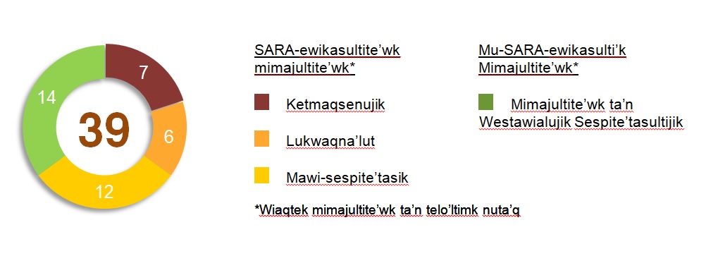 39 mimajultite’wk ta’n kaqisk telitpiaq na Kejimkujik aqq NHSs ta’n Msit-maqmikew NS na wesku’tasik ta’n ula tel-lukwek kisitasik: 25 SARA-ewikasultijik mimajultite’wk aqq 14 me’ mimajultite’wk ta’n westawialujik sespite’tmujik e.g., COSEWIC jikeyujik katu mu SARA-ewikasultijik, provincially ewikasultijik aqq/kisna telo’ltimkewe’k nuta’jik mimajultite’wk. Newtiska’q jel si’st ta’n SARA-ewikasultijik mimajultite’wk na Ketmaqseto’tkik, Ketmaqsenutkik, kisna Lukwaqna’lujik (aqq nuta’q na tel-lukwek kisitasik elt ta’n SARA) aqq 12 na Mawi-Sespite’tasik. Asukom telo’ltijik nuta’jik mimajultite’wk na ta’n nenusnik ukjit wiaqa’luksinew ta’n na Mi’kma’q ta’n NS ta’n na mu nike’ SARA-ewikasultite’wk. Wiaqtek mu-SARA-ewikasulti’k mimajultite’wk ta’n westawialujik sespite’tmujik aqq mimajultite’wk ta’n telo’ltimk nuta’q iknmuetoq na nestasik kisitasik ukjit mimajultite’wk westawialujik aqq apaji-msnujik ta’n na etek.