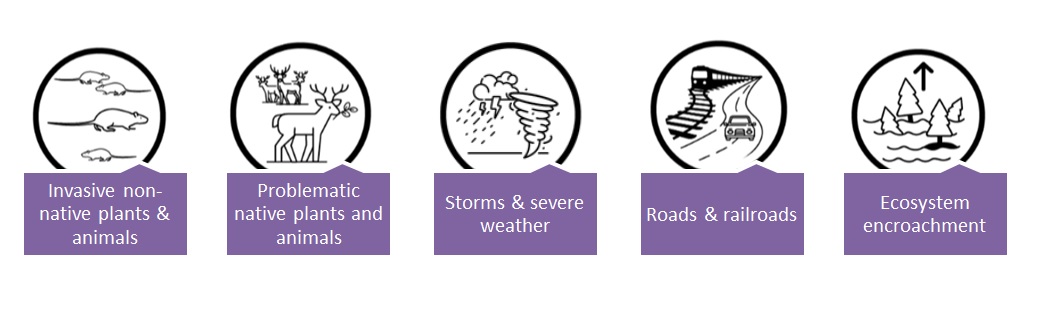 Five graphic bubbles depicting the five main threats to species at risk in KNPNHS and NHSs in Mainland NS which are: invasive non-native plants and animals, problematic native plants and animals, storm & severe weather, roads & railroads, and ecosystem encroachment.