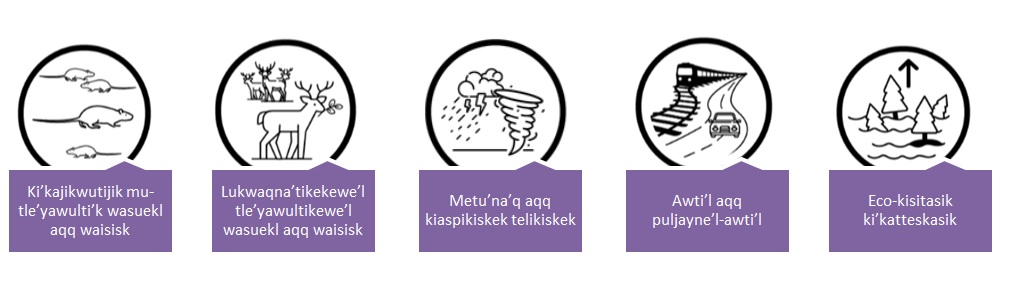 Five graphic bubbles depicting the five main threats to species at risk in KNPNHS and NHSs in Mainland NS which are: invasive non-native plants and animals, problematic native plants and animals, storm & severe weather, roads & railroads, and ecosystem encroachment. Text is written in Mi’kmaq.