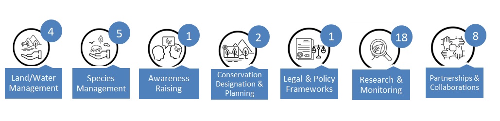 32 conservation and recovery measures are identified as commitments in this action plan. An additional 61 measures will be implemented if resources and/or partnerships become available to support the work. The number of committed measures and their action categorizationsFootnote 5 are presented below: