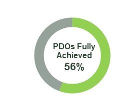 This diagram shows two thick rings, each segmented into two parts. The segments reflect a percentage of Population and Distribution Objectives partially achieved and fully achieved in the action plan, and are weighted accordingly. One ring shows the Population and Distribution Objectives that are partially achieved (100%), while the other ring shows the Population and Distribution Objectives that are fully achieved (56%). The percentages are shown as numbers in the centre of the rings as well.
