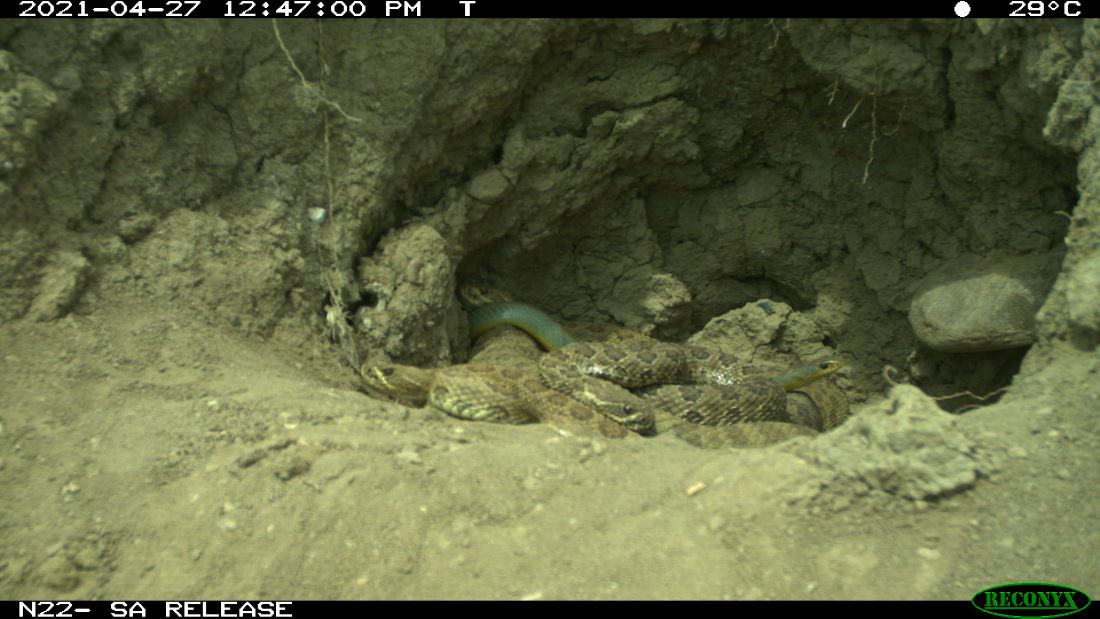 This figure consists of two photos. The first photo shows a burrow on a slope, surrounded by bare soil. At least three prairie rattlesnakes are visible in the burrow entrance, all piled on top of each other. The rattlesnakes have large, saddle-shaped spots running down their backs, with two stripes running down each side of their diamond-shaped heads. Their tails are not visible in the photo. An eastern yellow-bellied racer can also be seen slithering through the pile of rattlesnakes from the left-hand side moving to the right. The body is solid with no patterning visible. The head is narrow with a small beady eye.