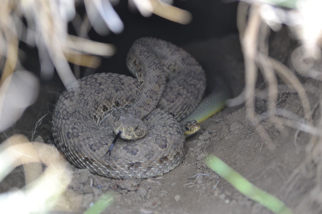 The second photo is of a different burrow consisting of bare soil, with some grass around the entrance in the foreground. There are two snakes visible inside the burrow, facing the camera. On the left there is a prairie rattlesnake, coiled up with its neck arched and ready to strike. The rattlesnake has large, saddle-shaped spots running down its back, with two stripes running down each side of its diamond-shaped head. Its forked tongue is sticking out. On the right there is an eastern yellow-bellied racer, tucked under one of the coils of the rattlesnake. The racers head and part of its body are visible, but the rest of the snake disappears down into the burrow. The racer's body is solid with no patterning visible. The head is narrow with a small beady eye.