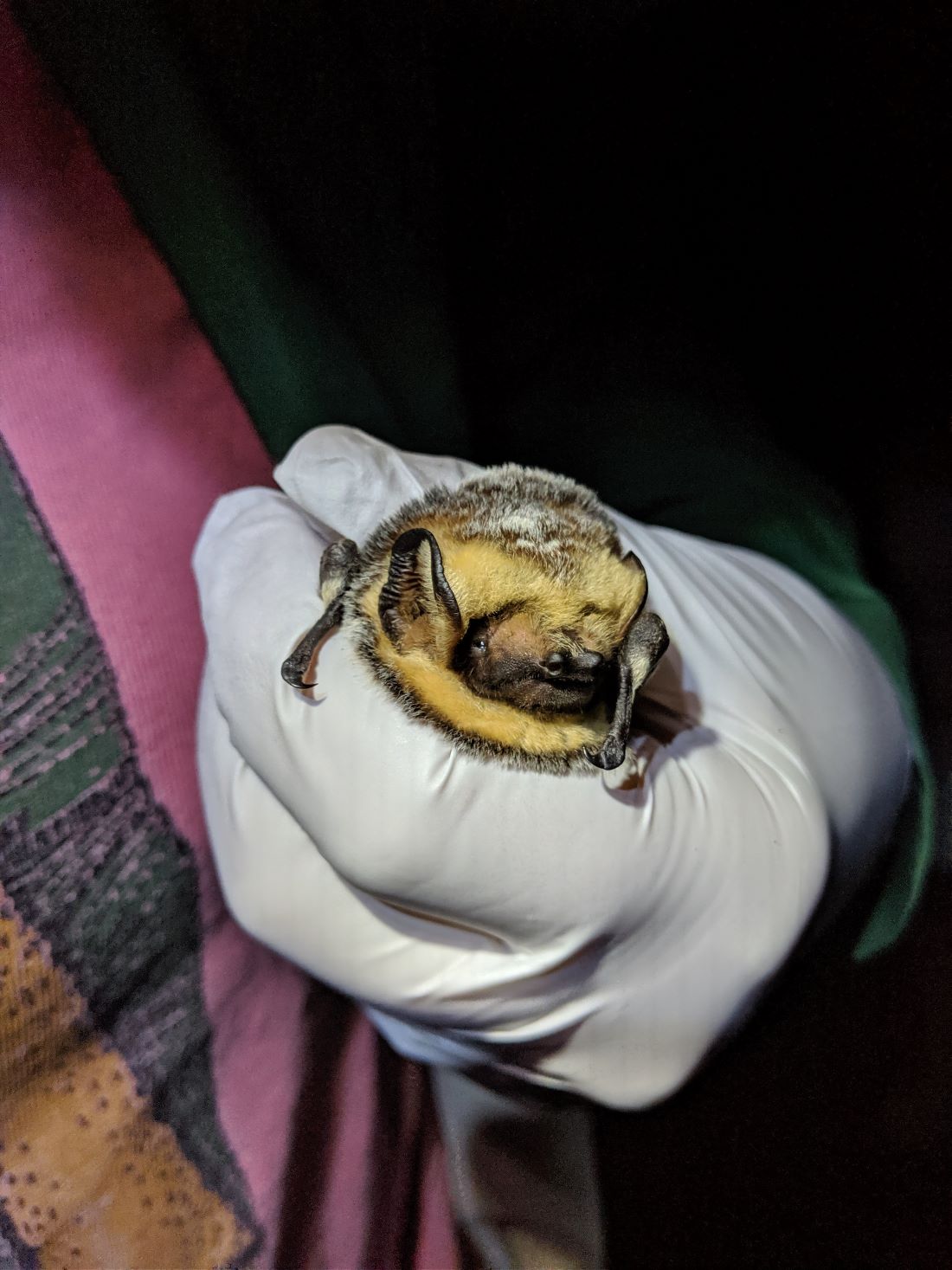 This figure consists of two photos. The first photo is a close-up of a little brown myotis bat. A human hand wearing a nitrile glove can be seen holding the bat, which is looking towards the left-hand side of the photo. The bat is small, mouse-sized, and furry with pointed ears. Its leathery wings are folded to its sides, and a small claw can be seen on the tip of its left wing. Its eyes are open and very small. The background is only darkness, and there is nothing else visible.