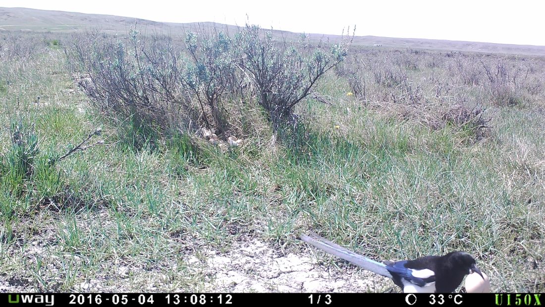 The third photo shows a different artificial nest, surrounded by grasses and sagebrush shrubs. Some bare soil is also visible in the foreground. The nest itself is immediately adjacent to a large sagebrush, and broken egg shells and feathers are visible within the nest. A magpie can be partially seen in the foreground of the photo, with an egg in its beak. The magpie is walking on the ground away from the nest with its wings folded, and it has a long thin tail and a long pointed beak. Rolling hills can be seen in the distant background, and the sky is overcast.