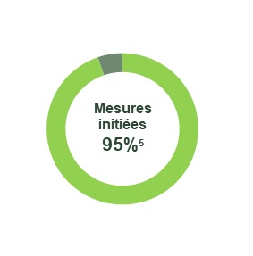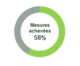 Ce diagramme deux anneaux épais, chacun divisé en deux parties. Les segments affichent un pourcentage des mesures de rétablissement du plan d’action qui ont été amorcées et achevées, et sont pondérés en conséquence. L’un des anneaux montre les mesures du plan amorcées (95 %), tandis que l’autre montre les mesures achevées (58 %). Les pourcentages sont également indiqués sous forme numérale au centre des cercles.