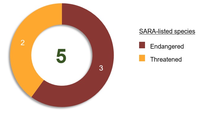 This diagram shows a thick ring that is segmented into sections. Each section of the ring reflects a category of SARA classification, and is weighted in size based on the number of species in each category. The total number of species included in this report is reflected by a number in the middle of the ring. The diagram shows 5 total species, including 3 Endangered species, and 2 Threatened species.