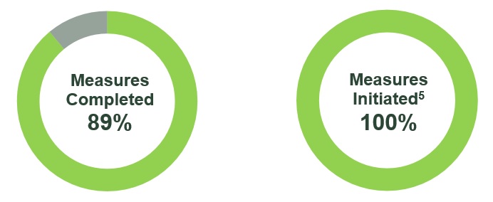 This diagram shows two separate, thick rings. One ring shows that 100% of the measures in the action plan have been initiated and the other ring shows that 89% of the measures have been completed.