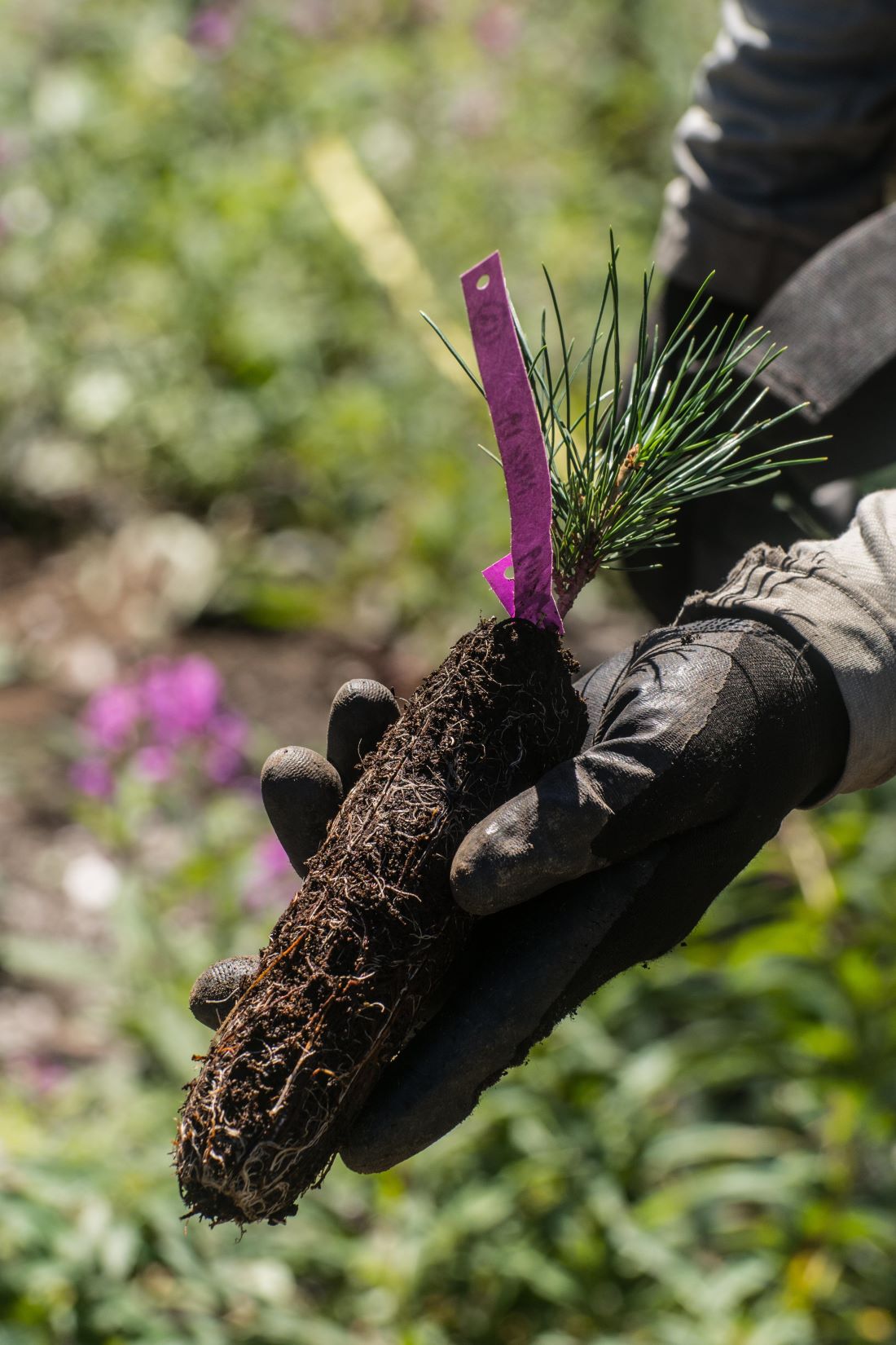 This is a photograph of a Whitebark Pine seedling about to be planted in the ground. The seedling is small with a long plug. There is a tag looped around the stem that denotes the parentage of the tree. A staff member is holding the plug with a gloved hand.