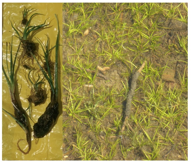 Habitat de l’isoète de Bolander (Parcs Canada) et plantes individuelles d’isoète de Bolander (médaillon).