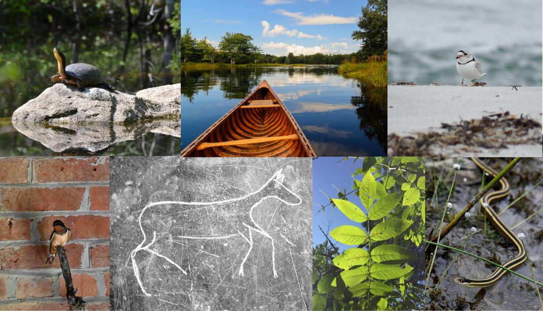 La page couverture comporte une série de sept photos, dont les descriptions sont présentées selon le sens des aiguilles d’une montre, à partir du coin supérieur gauche : Tortue mouchetée (Emydoidea blandingii), photo : Jeffie McNeil; pétroglyphe, photo : Parcs Canada; Pluvier siffleur (Charadrius melodus melodus), photo : A. DiMarco; wisqoq (Fraxinus nigra), photo : Cody Chapman; Couleuvre mince (Thamnophis sauritus), photo : Wesley Pitts; canot, photo : Éric Le Bel; Hirondelle rustique (Hirundo rustica), photo : Jennifer Eaton.