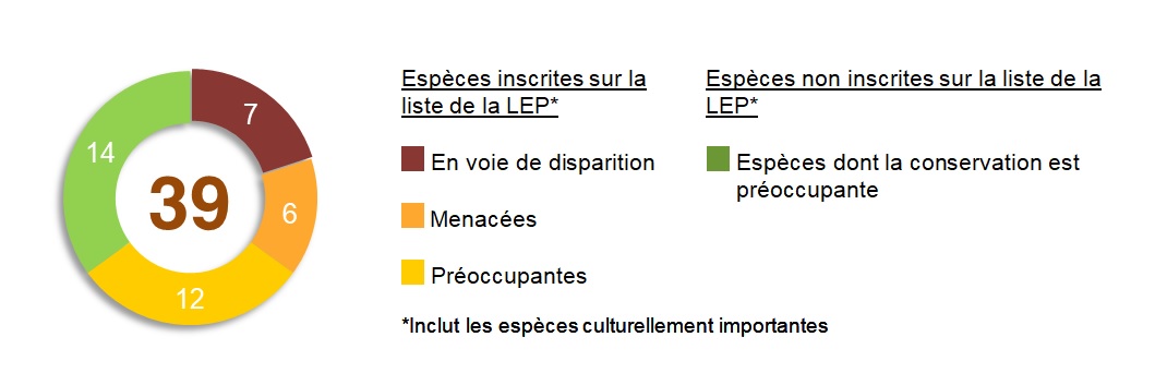 39 espèces régulièrement présentes à Kejimkujik ainsi que dans les LHN de la Nouvelle-Écosse continentale sont prises en compte dans ce plan d’action : 25 espèces inscrites sur la liste de la LEP et 14 autres espèces dont la conservation est préoccupante (p. ex. espèces évaluées par le COSEPAC, mais non inscrites sur la liste de la LEP, espèces inscrites sur la liste provinciale ou espèces culturellement importantes). Treize des espèces inscrites sur la liste de la LEP sont disparues du pays, en voie de disparition ou menacées (et nécessitent un plan d’action en vertu de la LEP) et 12 sont préoccupantes. Les Mi’kmaq de Nouvelle-Écosse ont identifié six espèces comme étant culturellement importantes, mais qui ne sont pas actuellement inscrites sur la liste de la LEP. L’inclusion d’espèces dont la conservation est préoccupante et d’espèces culturellement importantes non inscrites sur la liste de la LEP permet d’établir un plan global pour la conservation et le rétablissement des espèces sur le site.