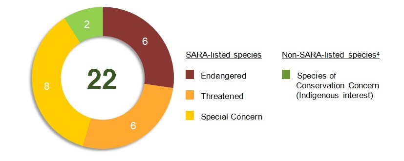 This diagram shows a thick ring that is segmented into sections. Each section of the ring reflects a category of SARA classification, and is weighted in size based on the number of species in each category. The total number of species included in this report is reflected by a number in the middle of the ring. The diagram shows 22 total species, including 6 Endangered species, 6 Threatened species, 8 Special Concern species, and 2 non-SARA listed speciesFootnote 4 of conservation concern.