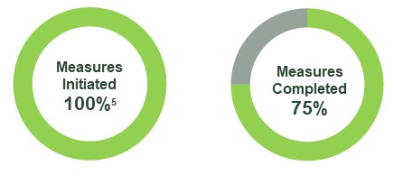 This diagram shows two separate, thick rings. One ring shows that 100% of the measures in the action plan have been initiated and the other ring shows that 75% of the measures have been completed.