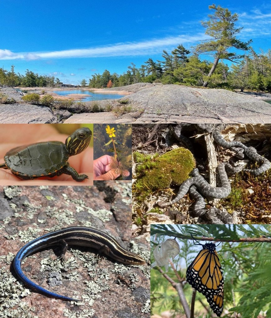 La page de couverture comporte six photos placées dans le sens des aiguilles d’une montre. La photo du haut présente un paysage de l’île Beausoleil avec, au premier plan, un substrat rocheux du Bouclier canadien. Des pins blancs se dressent autour d’un bras de la baie Georgienne. Les autres photos montrent des espèces trouvées dans le parc : des massasauga se chauffant au soleil sur des débris de bois; un papillon monarque suspendu à une branche, tête en bas; un jeune scinque pentaligne à la queue bleu vif installé sur un rocher; un bébé tortue peinte du Centre dans la main d’une personne; et un bident de Beck dans son milieu humide.
