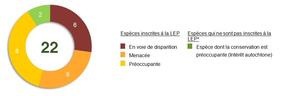 Le diagramme montre un anneau large divisé en segments. Chaque segment représente une catégorie des espèces classées selon la Loi sur les espèces en péril (LEP), et leur taille est proportionnelle au nombre d’espèces dans chaque catégorie. Le nombre inscrit dans le milieu de l’anneau indique le total d’espèces incluses dans le rapport. Le diagramme présente 22 espèces au total, dont six (6) espèces en voie de disparition, six (6) espèces menacées, huit (8) espèces préoccupantes et deux (2) espèces non inscrites à la LEPNote de bas de page 4 dont la conservation est préoccupante.