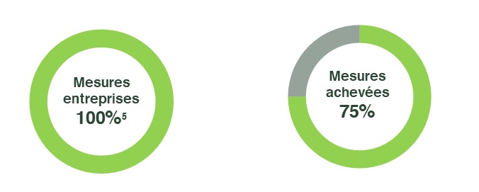 Le diagramme montre deux anneaux larges distincts. L’un des anneaux indique un taux de 100 % pour les mesures initiées dans le plan d’action, et l’autre, un taux de 75 % pour les mesures achevées.