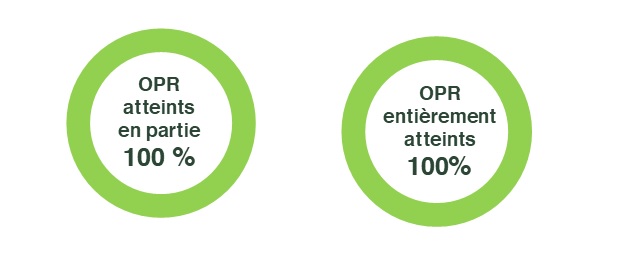 Le diagramme montre deux anneaux larges distincts. L’un des anneaux indique un taux de 100 % pour les objectifs en matière de population et de répartition partiellement atteints, tandis que l’autre anneau indique un taux de 100 % pour les objectifs entièrement atteints.