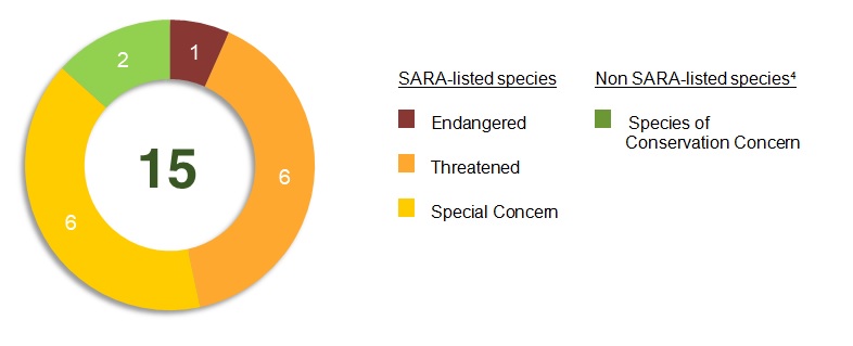 This diagram shows a thick ring that is segmented into sections. Each section of the ring reflects a category of SARA classification, and is weighted in size based on the number of species in each category. The total number of species included in this report is reflected by a number in the middle of the ring. The diagram shows 15 total species, including 1 Endangered species, 6 Threatened species, 6 Special Concern species, and 2 non-SARA listed species of conservation concern.Footnote 4