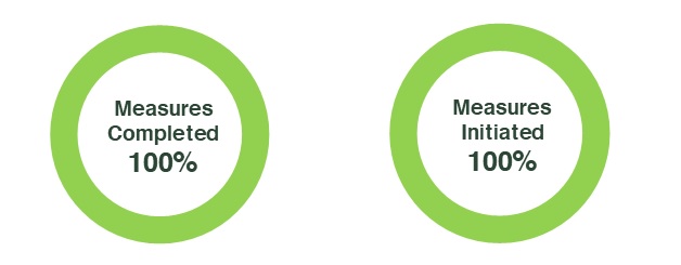This diagram shows two separate, thick rings. One ring shows that 100% of the measures in the action plan have been initiated and the other ring shows that 100% of the measures have been completed.