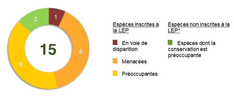 Le diagramme montre un anneau large divisé en segments. Chaque segment représente une catégorie des espèces classées selon la Loi sur les espèces en péril (LEP), et leur taille est proportionnelle au nombre d'espèces dans chaque catégorie. Le nombre inscrit dans le milieu de l'anneau indique le total d'espèces incluses dans le rapport. Le diagramme présente 15 espèces au total, dont une (1) espèces en voie de disparition, six (6) espèces menacées, six (6) espèces préoccupantes et deux (2) espèces non inscrites à la LEP dont la conservation est préoccupanteNote de bas de page 4.