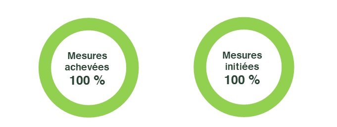 Le diagramme montre deux anneaux larges distincts. L'un des anneaux indique un taux de 100 % pour les mesures initiées dans le plan d'action, et l'autre, un taux de 100 % pour les mesures achevées.