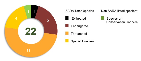 This diagram shows a thick ring that is segmented into sections. Each section of the ring reflects a category of SARA classification, and is weighted in size based on the number of species in each category. The total number of species included in this report is reflected by a number in the middle of the ring. The diagram shows 22 total species, 1 Extirpated species, 5 Endangered species, 11 Threatened species, 4 Special Concern species, and 1 non-SARA listed speciesFootnote 4 of conservation concern.