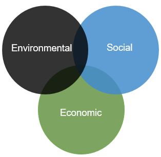 This diagram shows three circles overlapping with one another in an upside-down triangle shape. Each circle has text in the middle. The top left circle says "Environmental", the top right circle says "Social", and the bottom circle says "Economic".