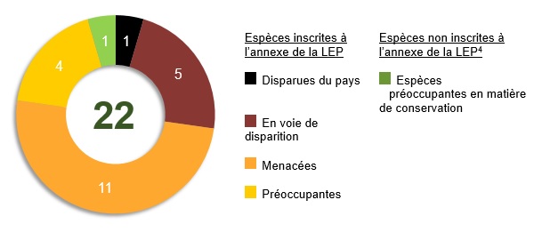 Ce diagramme consiste en un anneau épais divisé en segments. Chaque segment de l’anneau correspond à une catégorie de classification de la LEP, et sa taille est pondérée en fonction du nombre d’espèces que contient chaque catégorie. Le nombre total d’espèces comprises dans le présent rapport est représenté par un nombre au milieu du cercle. Le diagramme montre 22 espèces au total, soit 1 espèce disparue du pays, 5 espèces en voie de disparition, 11 espèces menacées, 4 espèces préoccupantes et 1 espèce non inscrite comme préoccupante en matière de conservation à l’annexe de la LEPNote de bas de page 4.