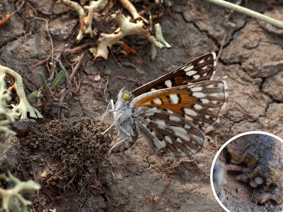 Cette photo montre un gros plan d’un papillon mormon. Le papillon est au sol, faisant face au côté gauche de la photo, avec ses ailes tachetées repliées vers l’arrière, du côté droit. Son corps est duveteux, et il a de grands yeux et de longues antennes. Ses six pattes s’accrochent à une parcelle de mousse et de lichen, et son abdomen est recourbé sous l’endroit où il pond ses œufs. Le sol entourant le papillon est dénudé, et d’autres types de lichen sont visibles. Dans le coin inférieur droit de la photo se trouve une photo plus petite, en médaillon. Elle montre un gros plan des œufs pondus par un papillon mormon. Les œufs se trouvent au milieu de la photo et ont la forme de deux petites sphères. Ils sont enfouis sous le bord d’une touffe de lichen, sur un sol dénudé. La plus grande partie de la photo montre un sol dénudé, avec du lichen et de la végétation, qui ne sont pas au centre mais plutôt sur les bords de la photo. Il y a aussi de la matière végétale morte au sol. La photo a été prise en si gros plan qu’il n’y a ni ciel ni arrière-plan visible.