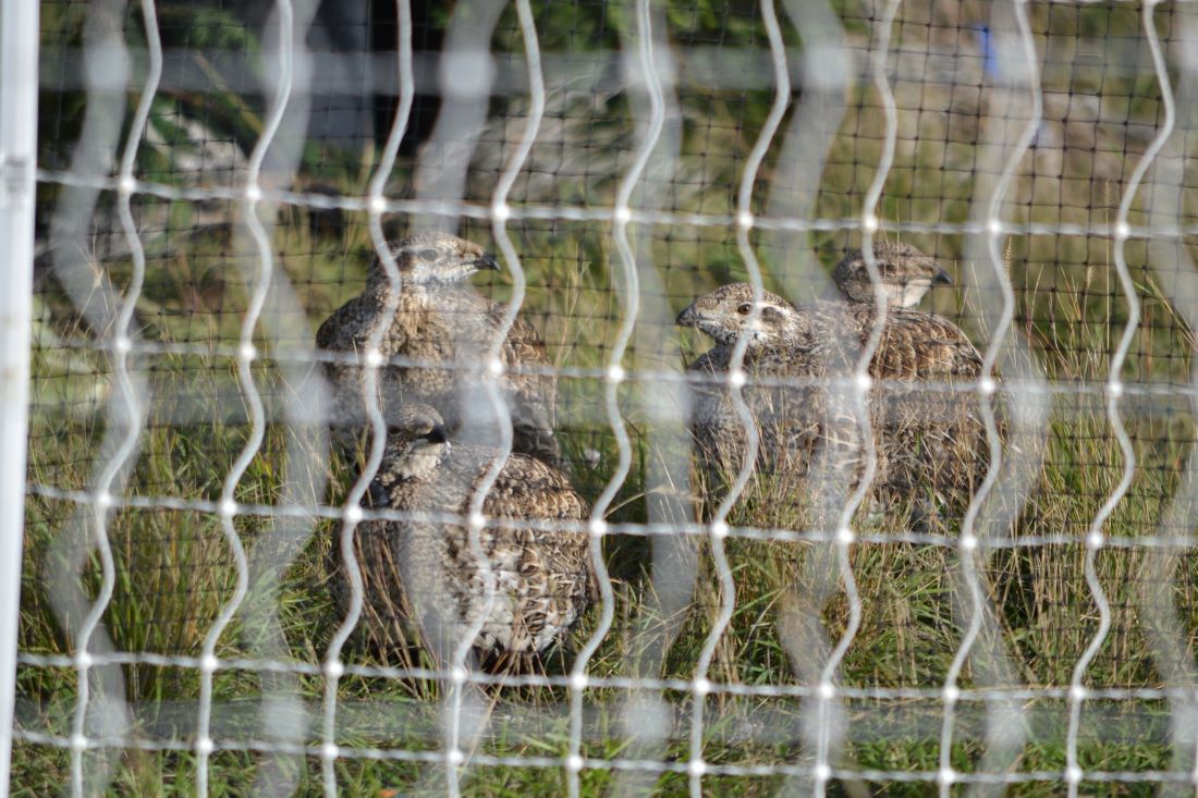 Cette photo montre quatre Tétras des armoises dans un enclos. Elle a été prise à travers les filets de côté de l’enclos. Le filet s’entrecroise au premier plan de la photo et, à travers, on voit les Tétras des armoises assis sur le sol, blottis les uns contre les autres. Le Tétras des armoises est un oiseau de taille moyenne, que l’on pourrait comparer à celle d’une petite dinde. Sur cette photo, leurs ailes sont repliées sur le côté, leur donnant une forme de ballon de football, et leurs têtes sont étirées. Les tétras sont entourés d’herbe.