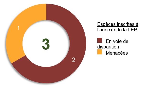 Le diagramme montre un anneau large divisé en segments. Chaque segment représente une catégorie des espèces classées selon la Loi sur les espèces en péril (LEP), et leur taille est proportionnelle au nombre d’espèces dans chaque catégorie. Le nombre inscrit dans le milieu de l’anneau indique le total d’espèces incluses dans le rapport. Le diagramme présente 3 espèces au total, dont 2 espèces en voie de disparition, et 1 espèces menacées.