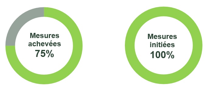 Le diagramme montre deux anneaux larges distincts. L’un des anneaux indique un taux de 100 % pour les mesures initiées dans le plan d’action, et l’autre, un taux de 75 % pour les mesures achevées.