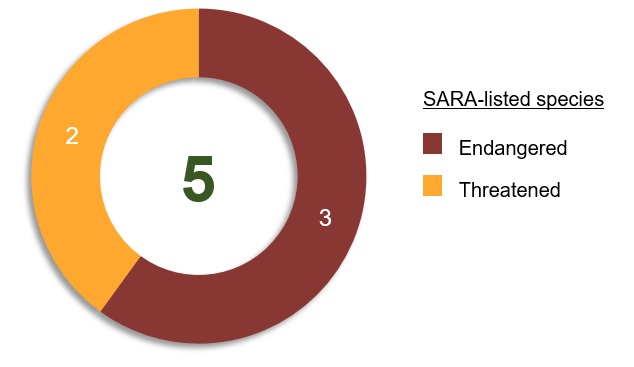 This diagram shows a thick ring that is segmented into sections. Each section of the ring reflects a category of SARA classification, and is weighted in size based on the number of species in each category. The total number of species included in this report is reflected by a number in the middle of the ring. The diagram shows 5 total species, including 3 Endangered species, and 2 Threatened species.