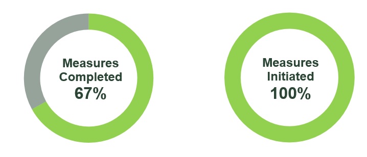 This diagram shows two separate, thick rings. One ring shows that 100% of the measures in the action plan have been initiated and the other ring shows that 67% of the measures have been completed.